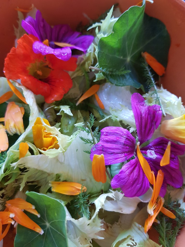 Je mets mes yeux de lynx, j’enfile la tenue souple et furtive du chat qui guette. À l’affût, sur le qui vive, je cible les taches oranges sur la ligne. C’est qu’elle a pas l’air comme ça la capucine, elle a mis sa robe de soirée, élégante et chatoyante, on pense qu’elle s’offre au regard qu’elle veut se faire voir, qu’elle est fort cantatrice, mais derrière ses grands airs elle voile une fragilité d’oiseau. Elle dit « laissez moi », et se dissimule derrière son paravent de feuilles de nénuphars. Il faut la comprendre; ses tiges creuses et cassantes cèdent au moindre geste brusque comme des talons aiguille. Le prix de l’élégance. A l’abri des regards dans son écrin de fraicheur, elle cultive son jardin secret. J’ouvre le rideau de feuilles, délicatement, et fouille dans les entrailles. Je cherche celle qui se dissimule. Ses boutons aussi, camouflés bien à l’ombre. Ceux là, ça fait toujours un peu mal de leur ôter la chance d’aller au bal, ils n’écloront jamais. Mais c’est, qu’après, en bouche, ils éclatent comme un feu d’artifice. Alors on se console. Et puis passer son chemin. Aller voir le bouquet suivant, comme un chasseur. Finir la ligne de cette manière. Et l’air de rien, comme en passant là par hasard, revenir par l’autre côté, nonchalamment. Car on en oublie toujours. Elle est coquine de se cacher comme ça, mais on la trouve et on la croque bien volontiers pour qu’elle dévoile son caractère: fort et puissant, piquant, épicé, généreux.