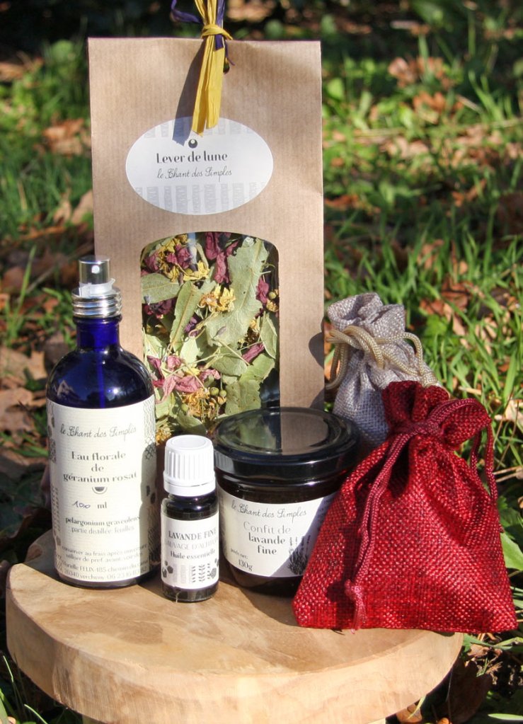 Par exemple; tisane sérénité, 1 eau florale de romarin détox, 1 HE lavande (détente), 1 HE Thym (antiseptique), 1 HE menthe (digestive), l’huile d’hélichryse anti-inflamatoire.